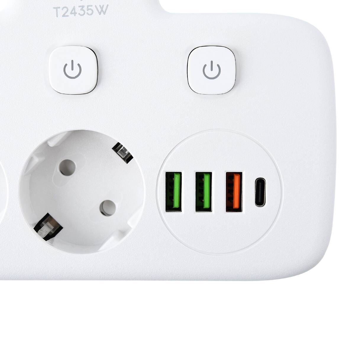 Сетевой тройник Amper 0,1м, 2 розетки, 3*0,75мм, 10А, 2500 Вт, 3usb, 1Type-C, 3кн, белый. T2435W