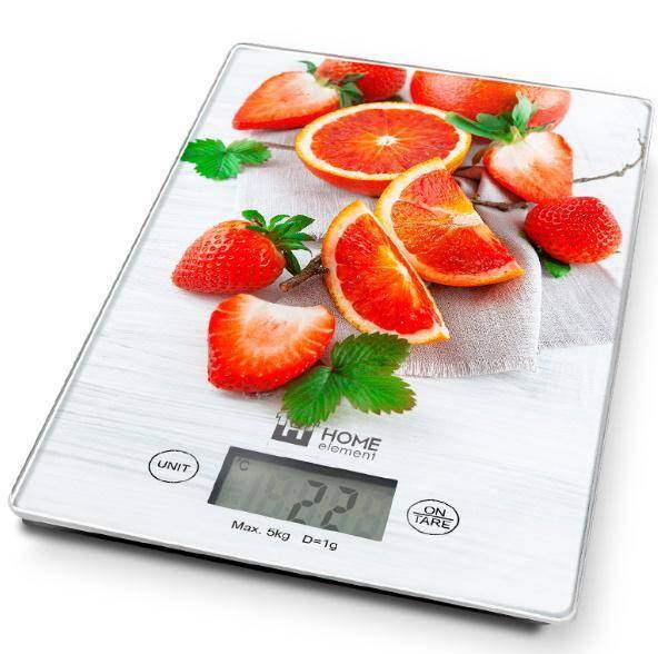 Весы кухонные HOME ELEMENT HE-SC932 фруктовый микс 5 кг, стекло ,LCD Дисплей, Функция "Тара"