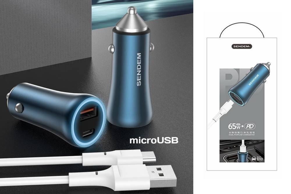 Автомобильное зарядное устройство АЗУ USB + кабель MicroUSB SENDEM D10 (PD18+QC3.0,4000mA) (синий)