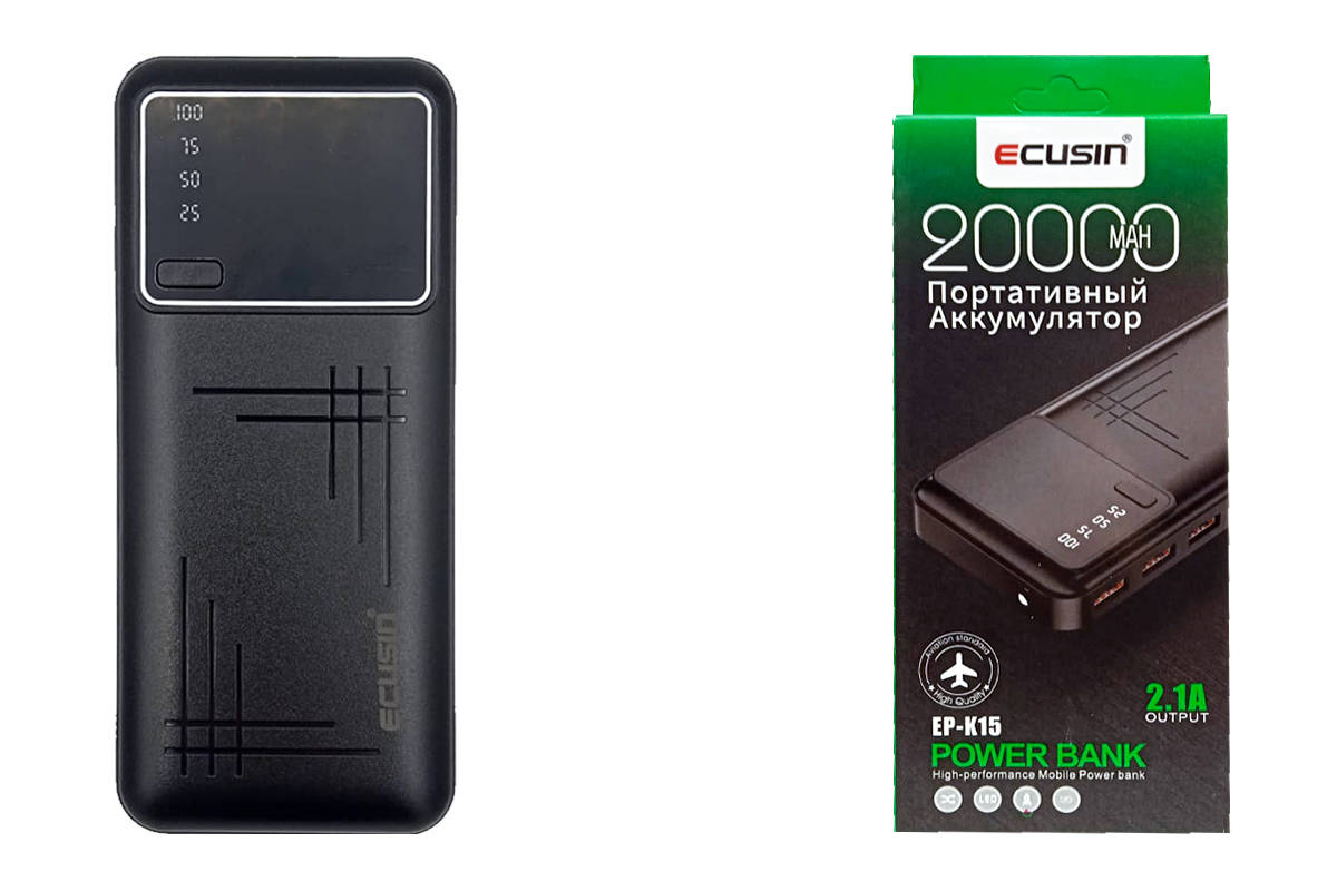 Универсальный дополнительный аккумулятор Power Bank ECUSIN EP-K15 (20 000 mAH) черный Универсальный дополнительный аккумулятор Power Bank ECUSIN EP-K15 (20 000 mAH) черный
